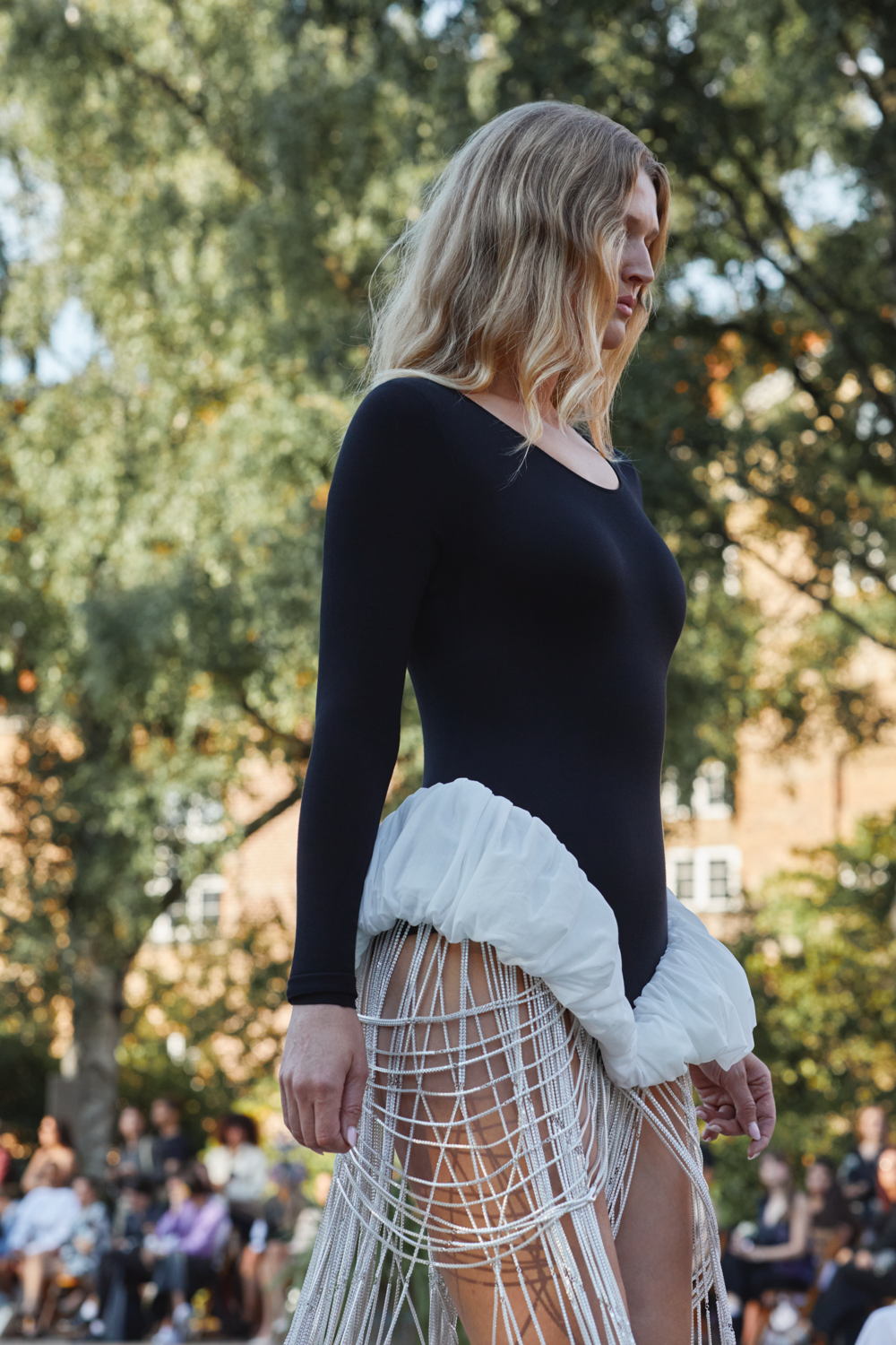 Piezas personalizadas, hechas a mano, por la artista Grete Henriette también aparecieron en el desfile. Un maxi vestido hecho con 2000 pulseras Pandora Timeless Silver Tennis marcó un statement artístico. Tanto los cinturones como las flores que adornaron las prendas del desfile, fueron hechos a mano utilizando más de 300 collares Pandora Moments bañados en oro amarillo de 14k para reflejar los motivos florales de la colección SS25 de Rotate.