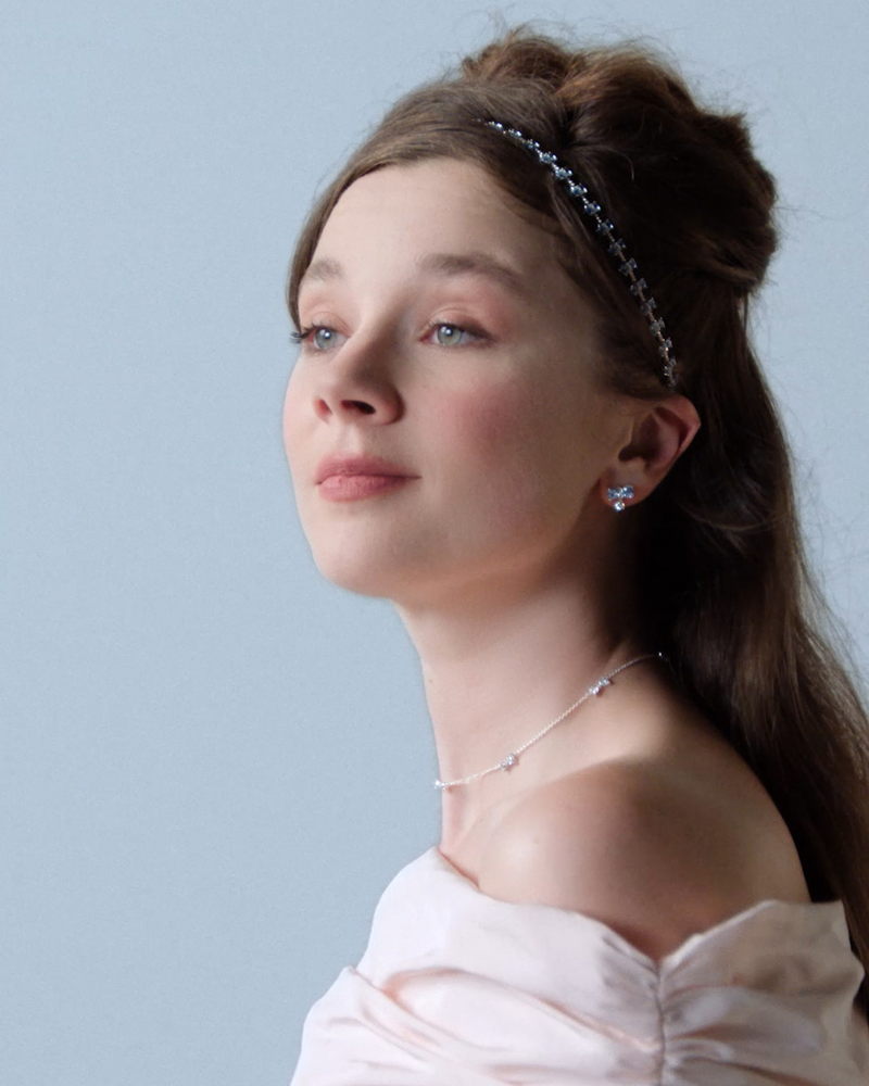 Flores elaboradas con detalles minuciosos,que en su momento se usaban para enviar mensajes secretos de amor, se combinan con perlas y moños en tonos pastel, incluido el característico lila de las glicinas que decoran el universo visual de Bridgerton. Desde ear climbers hasta collares, las piezas pueden mezclarse y combinarse de distintas maneras, invitando a la creatividad y a la autoexpresión.